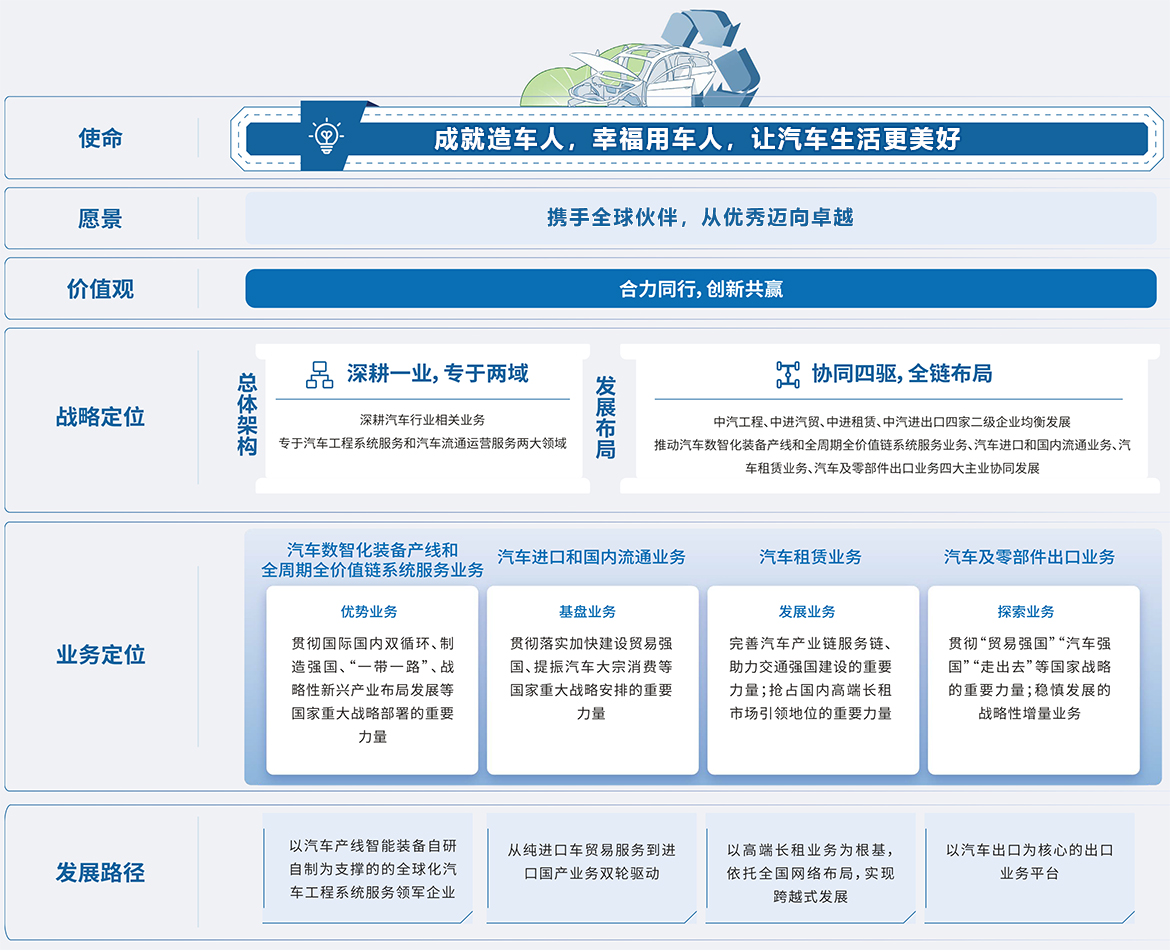 愿景:致力于成为国际化汽车进口和国内流通运营服务领军企业。