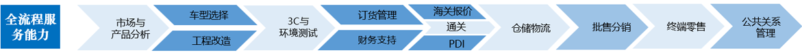 提供全链条、菜单式服务:战略咨询、市场分析、车型选择、工程改造、资金融通、认证协助、报关仓储、物流分销等