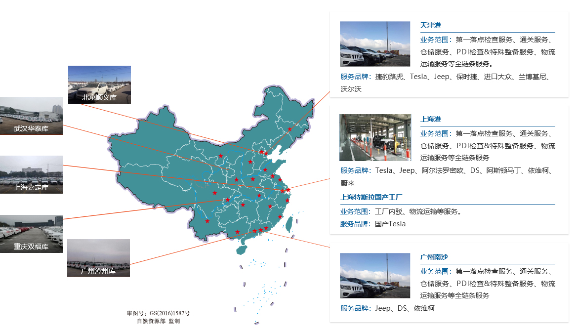在三个港口拥有仓储面积约40万平方米;在全国主要城市建立90余座区域中心库,实现从区域中心库至经销店的二次物流服务,大幅提高交车时效和客户体验